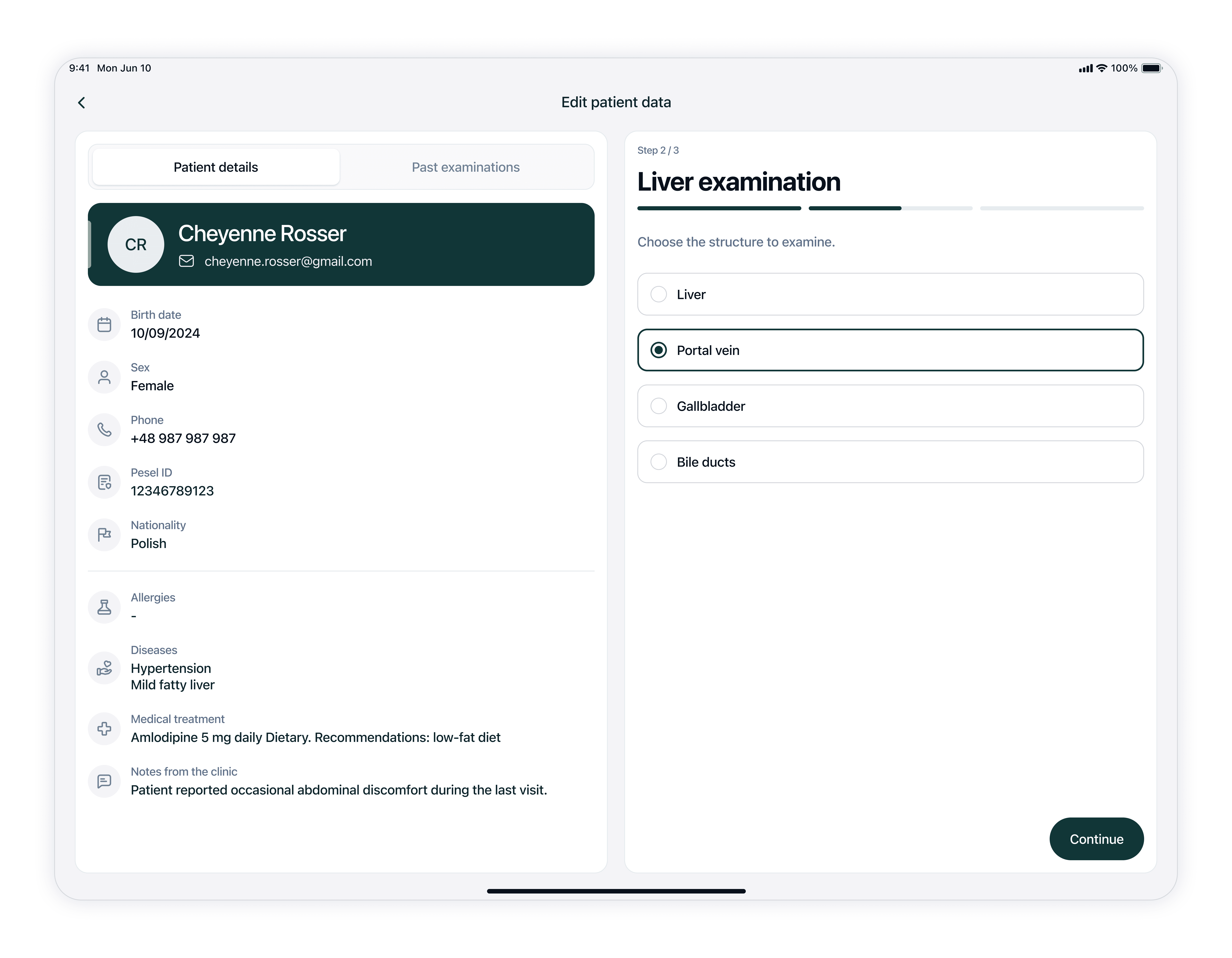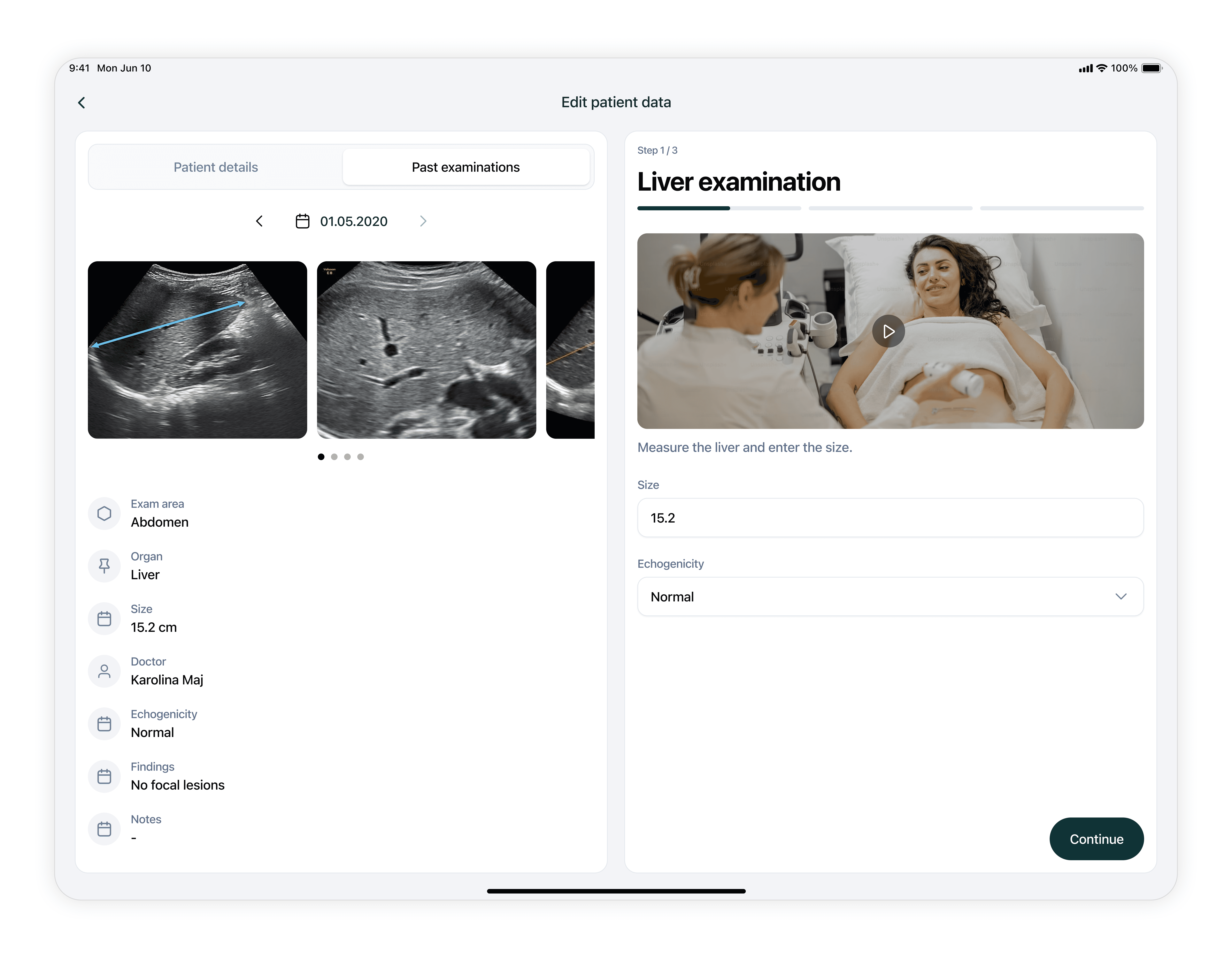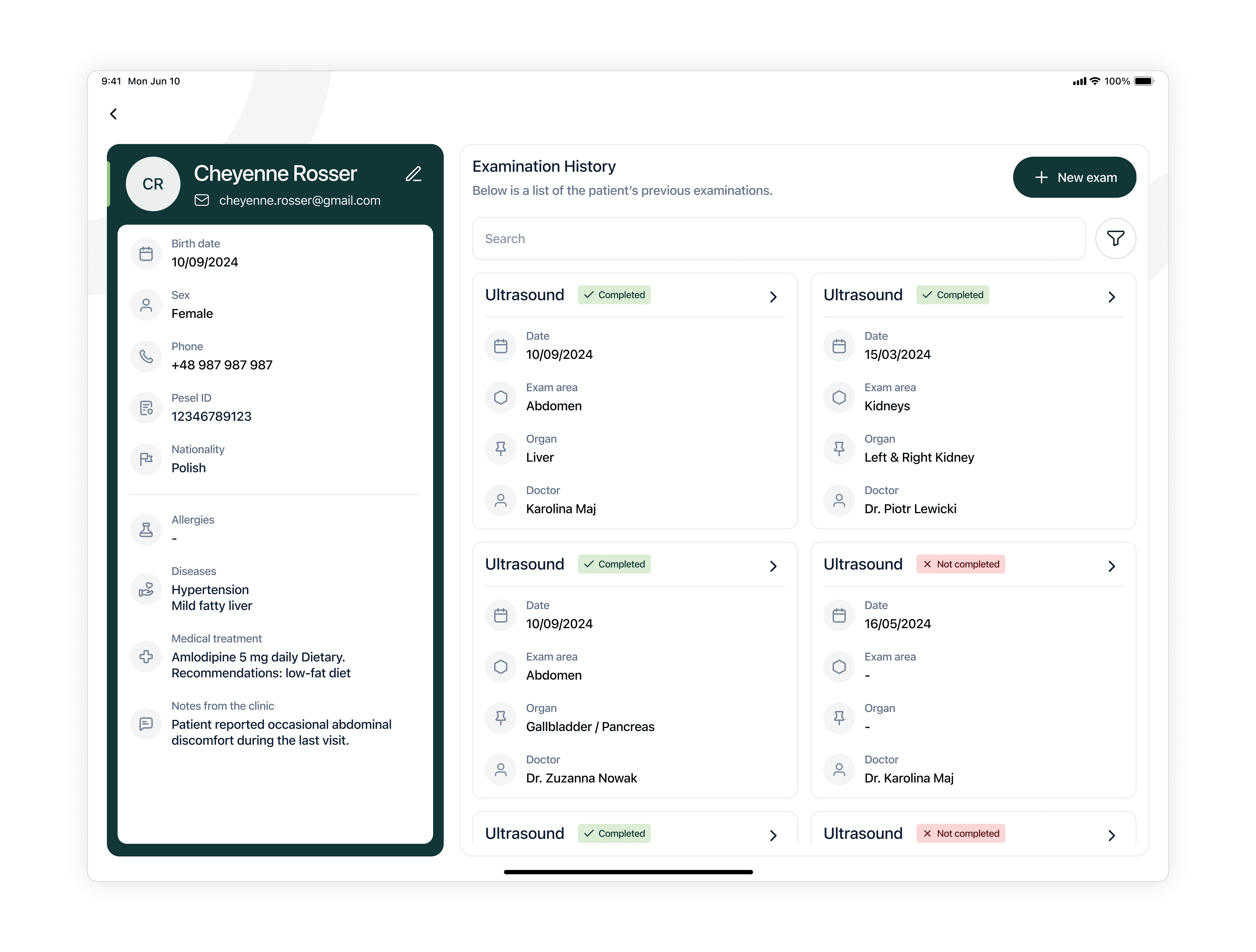 A dedicated examination screen where doctors can input measurements, review previous results, and compare data with previous results.